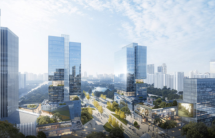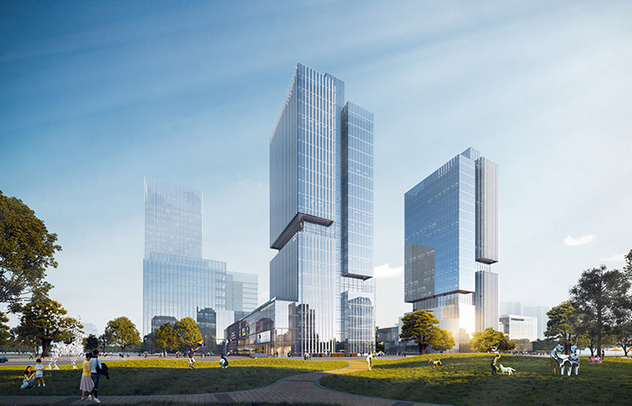 商業(yè)綜合體與鄰里中心,建筑體型與景觀空間互融,形體錯(cuò)動(dòng)豐富多變,金屬線條硬朗細(xì)膩,樹立現(xiàn)代門戶新標(biāo)。