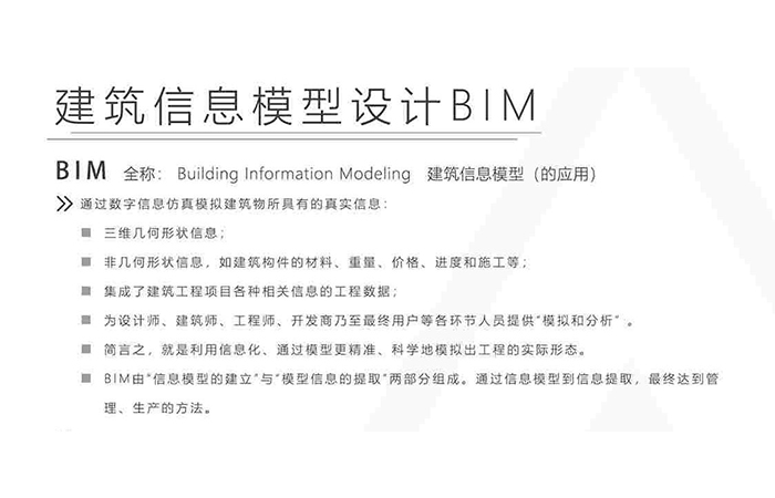 BIM由“信息模型的建立”與“模型信息的提取”兩部分組成。通過信息模型到信息提取,最終達到管理、生產(chǎn)的方法。