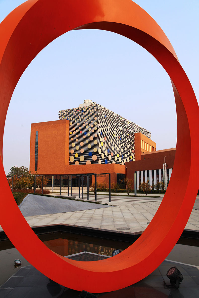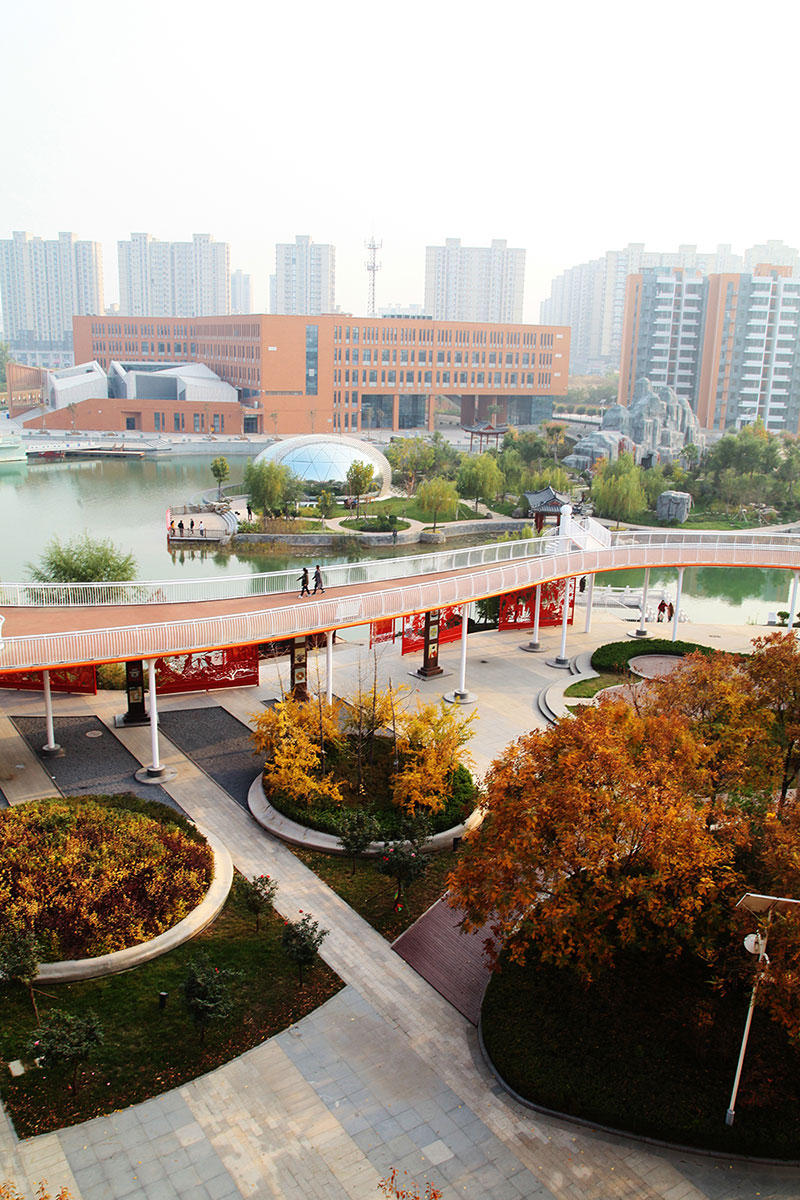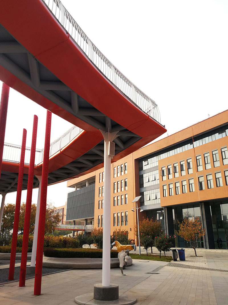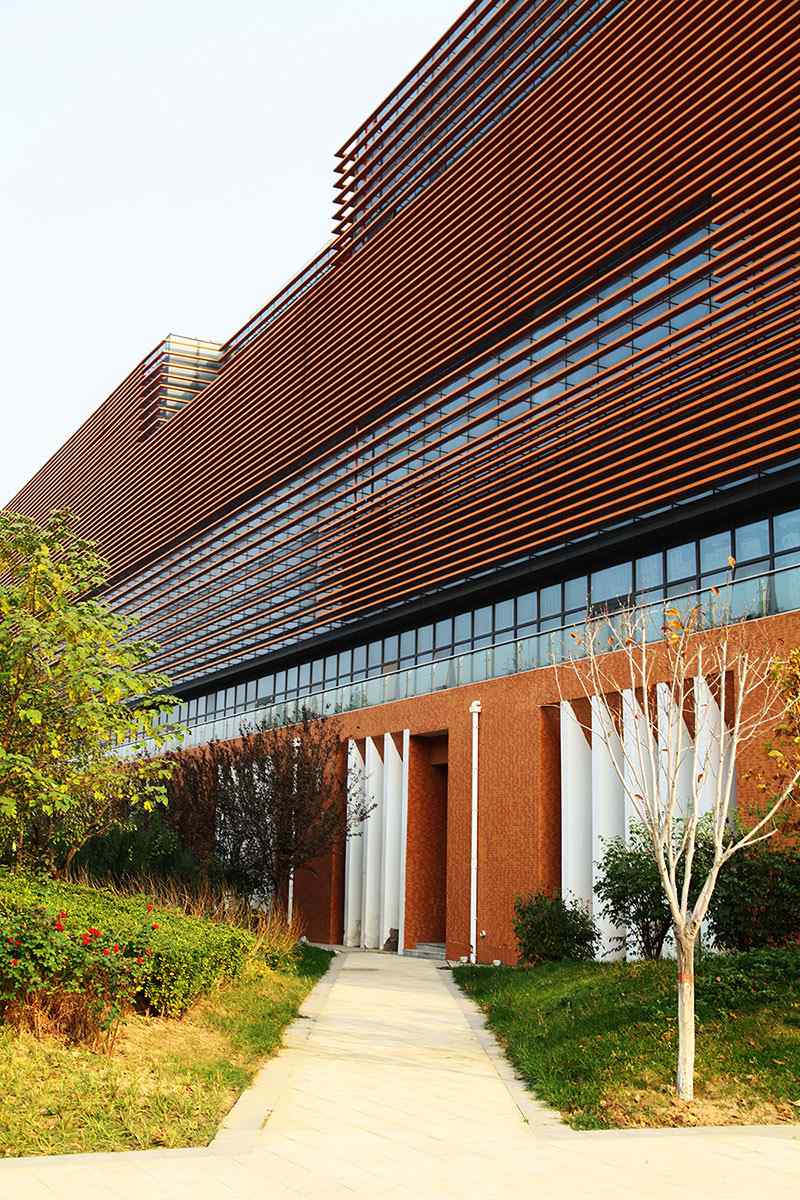 從整體規(guī)劃布局上看,校園內(nèi)各樓排布張弛有度,建筑與景觀(guān)相互結(jié)合,中央大湖與景觀(guān)廊架搭配蜿蜒蜷曲的步道,平靜中孕育詩(shī)意,給一所沉穩(wěn)的文化建筑帶來(lái)靈動(dòng)的韻律之美。