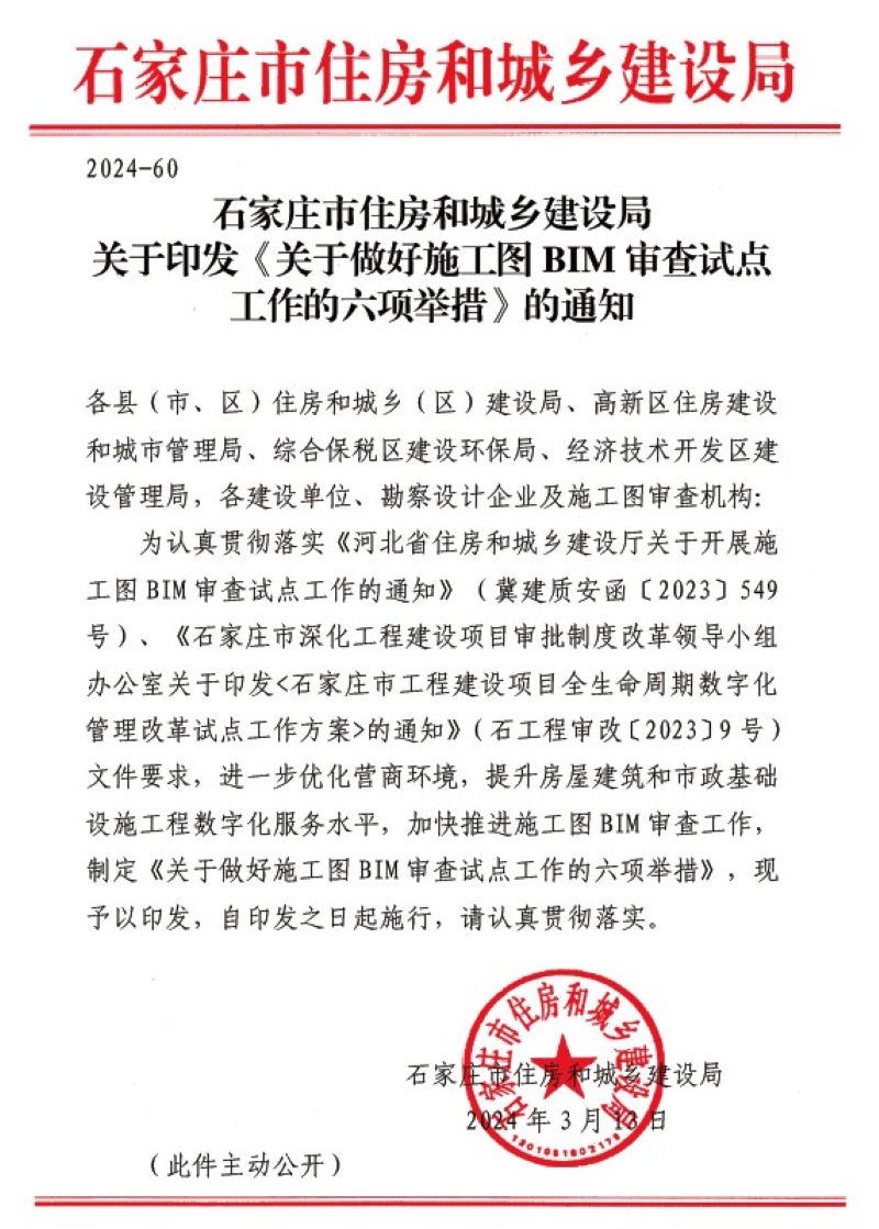 繼2023年12月7日河北省住房和城鄉(xiāng)建設廳發(fā)布《關于開展施工圖BIM審查試點工作》的通知,2024年3月13日石家莊市住房和城鄉(xiāng)建設局印發(fā)了《關于做好施工圖BIM審查十點工作的六項舉措》的通知,其中第一項舉措就提到了“自2024年4月1日起取得建筑工程規(guī)劃許可證的超高層建筑及政府投資公共建筑、城市綜合管廊、軌道交通項目須進行施工圖BIM審查,建設單位及勘察設計企業(yè)應登錄河北省施工圖數(shù)字化聯(lián)合審查系統(tǒng)進行BIM 審查項目申報,并提交BIM 設計成果!